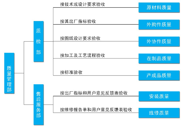公司設(shè)有質(zhì)量管理部,分為質(zhì)檢部和售后服務(wù)部。具體分工及檢驗(yàn)標(biāo)準(zhǔn)見(jiàn)下圖: